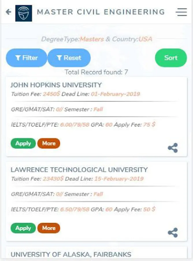 2) Shortlisting of Universities based on following Key