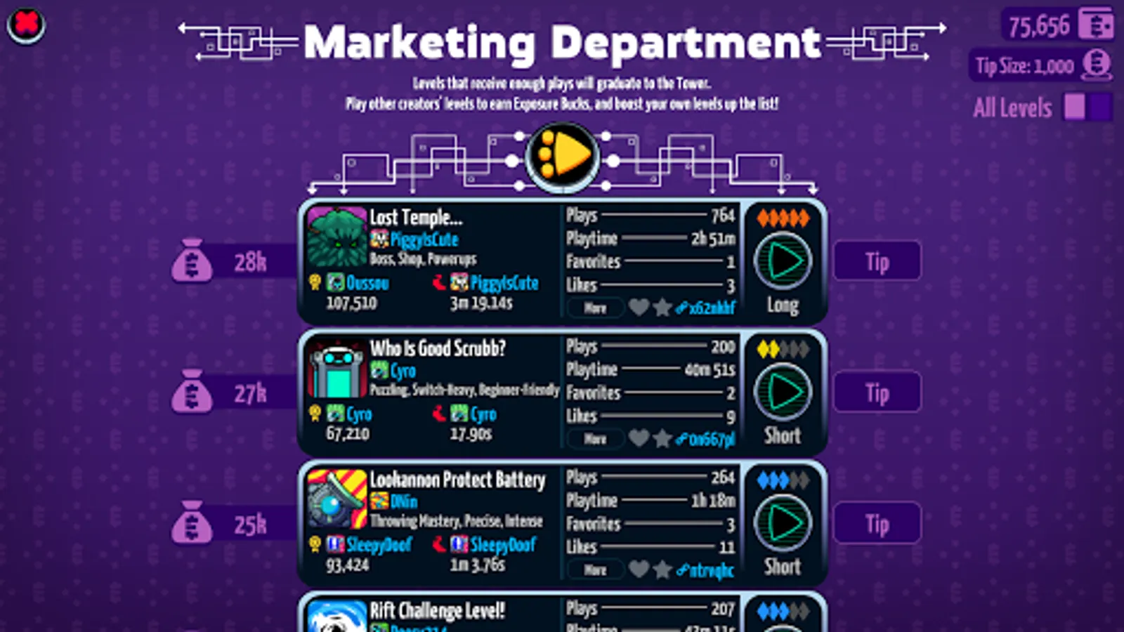 + Gain a following! Publish your Level to the entire world and see your Play Time, Attempts, and Followers stack up. With robust search and curation, Levelhead makes collecting followers and playing endless user generated content from around the world a breeze. Plus, the Marketing Department lets you push your Levels to the top of the charts just by playing the game, meaning you don't already have to be famous to get your Levels played!