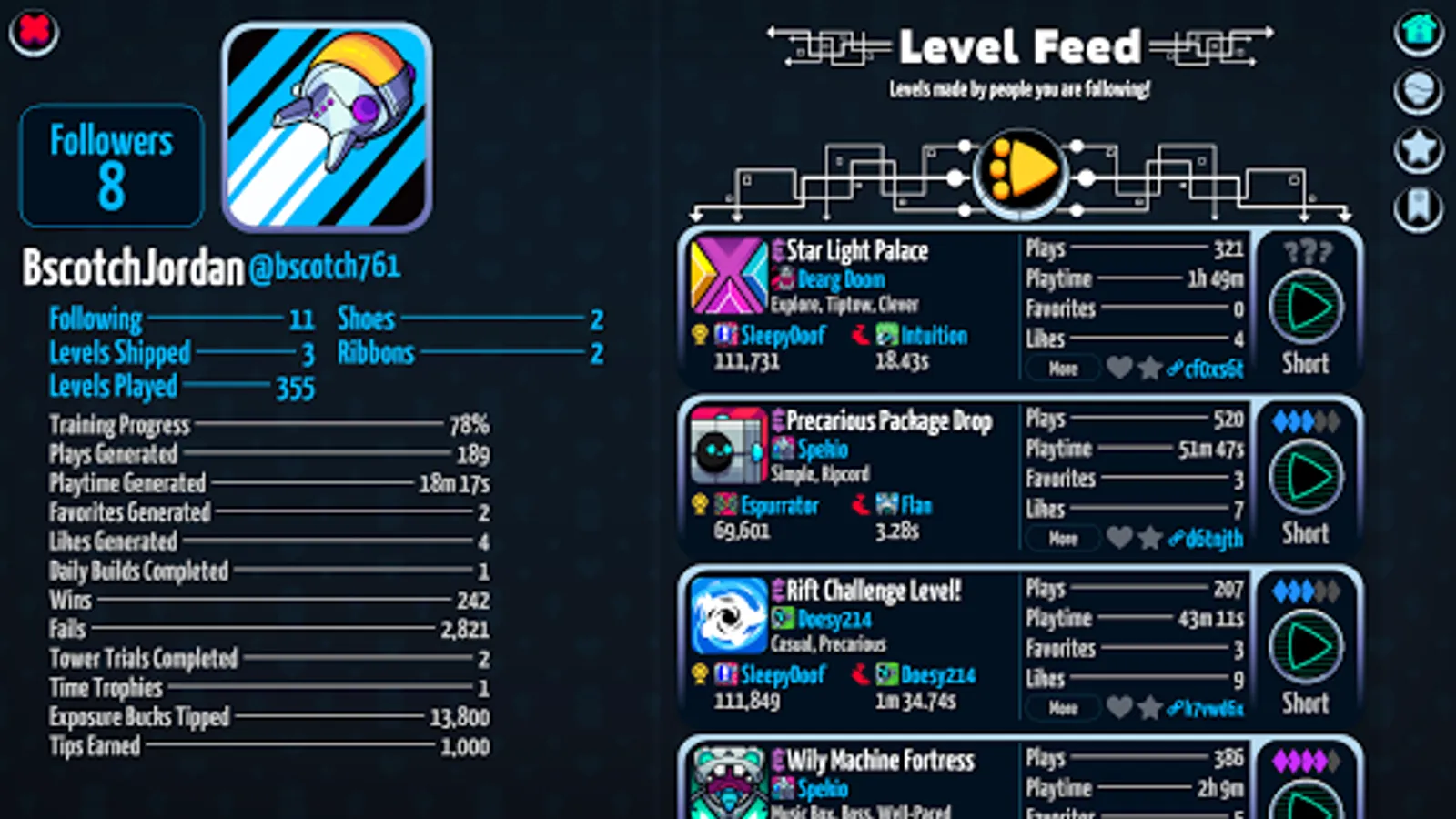 Build incredible contraptions and machines, craft adventurous expeditions that require brain and brawn to complete, or just create a relaxing music scene for other Levelheads to chill with. Once you've completed your Level, share it with the rest of the world... and gain a following! The Levelhead Division comes equipped with powerful curation and Following systems, so you'll always be able to find the best new Levels created by your colleagues.