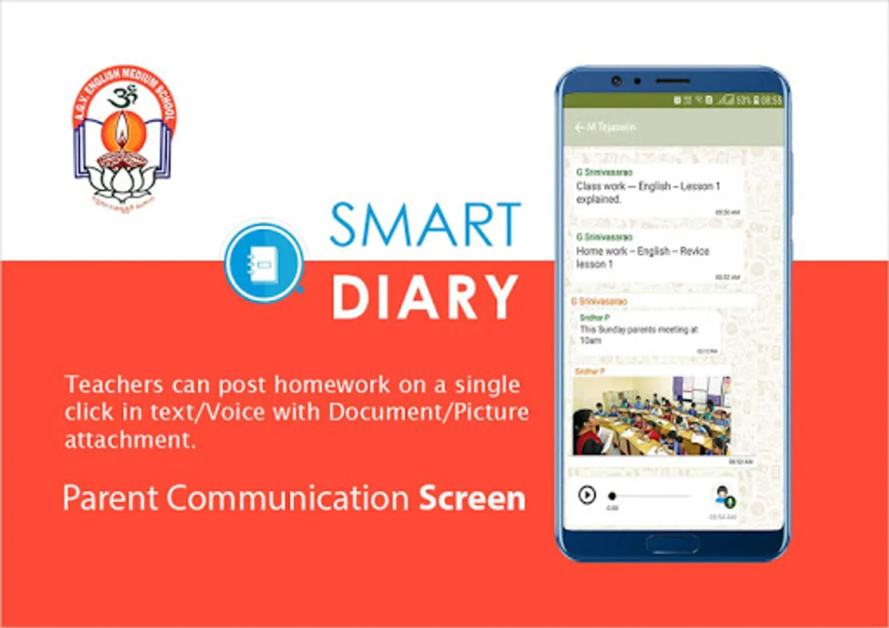 AGV E. M. School app provides an instant communication system for staff, teachers and parents. It helps the teachers send any kind of information regarding students to their parents instantly with just a click.