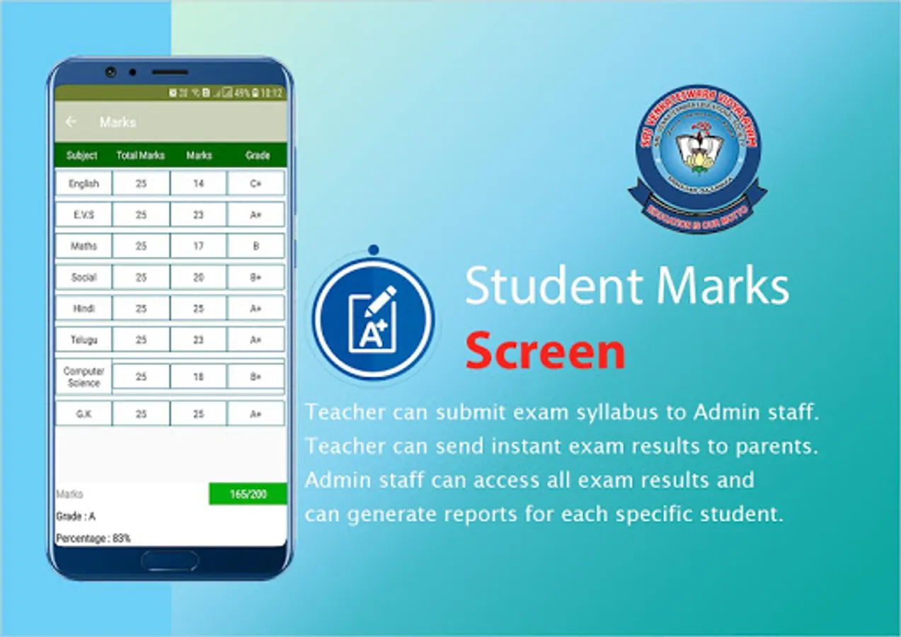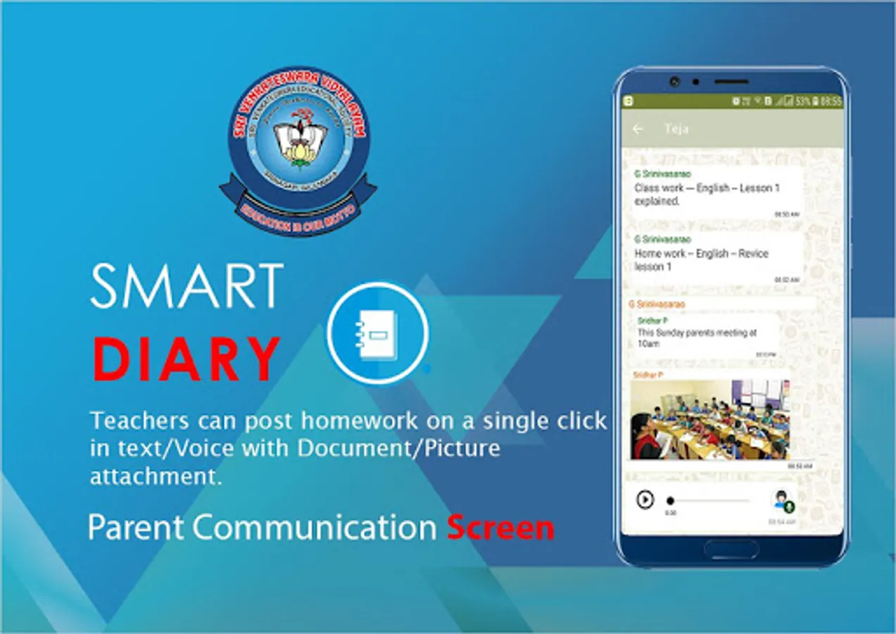 Sri Venkateswara Vidayalayam app provides an instant communication system for staff, teachers and parents. It helps the teachers send any kind of information regarding students to their parents instantly with just a click.