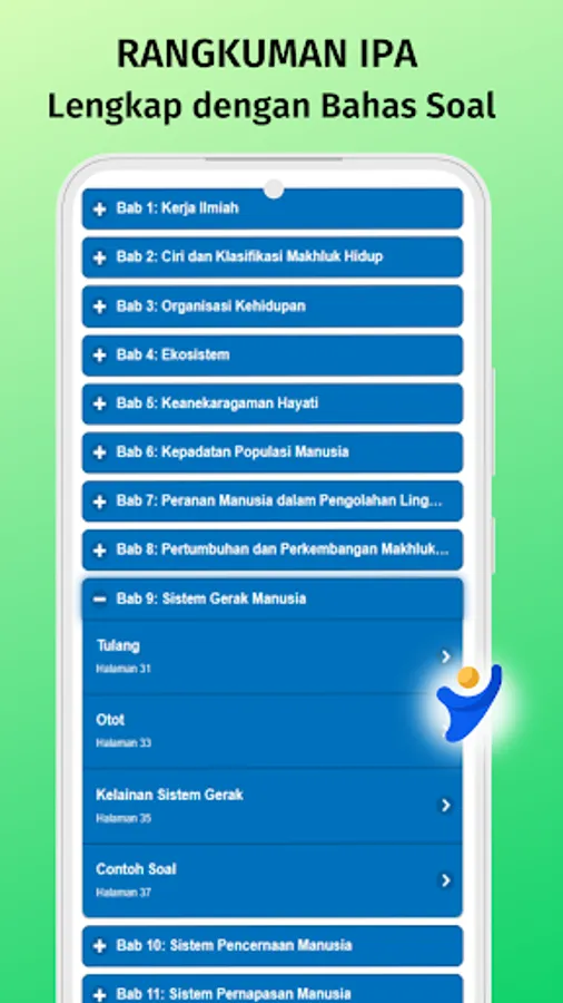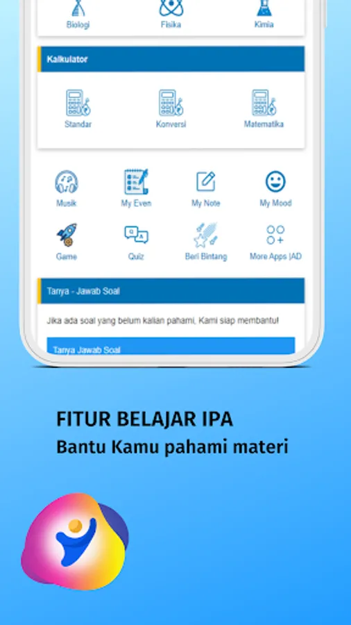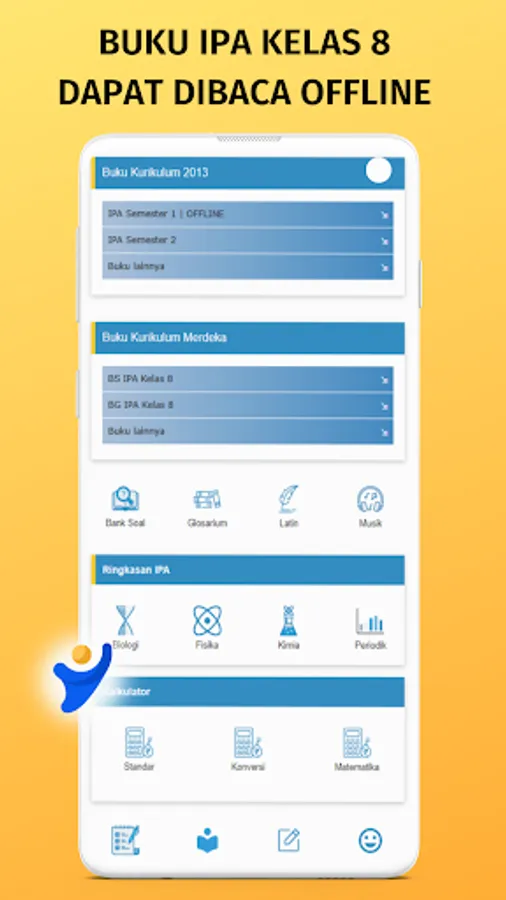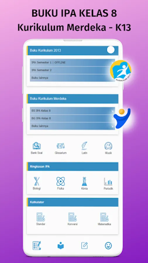 This android application is a student handbook digital application at the SMP/MTs level based on the Merdeka Curriculum and the latest revised edition of the 2013 Curriculum to help students in the learning process. This application is also equipped with a Science Teacher Guidebook for the Independent Curriculum and the latest edition of the 2013 Class 8 SMP/MTs Curriculum to facilitate and assist teachers in the teaching and learning process in the classroom.