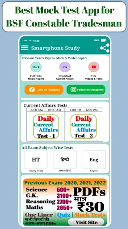 This is package of Practice sets or mock tests. It will help users to save their TIME and they can do more preparation for their Exams. It is based on CBT ( Computer based test) and online mode exams. By using this app, user can avoid understanding issues happened at the time of examination. User can get more practice sets by visiting our website. For any exam, user can get related practice sets of SMARTPHONE STUDY.
