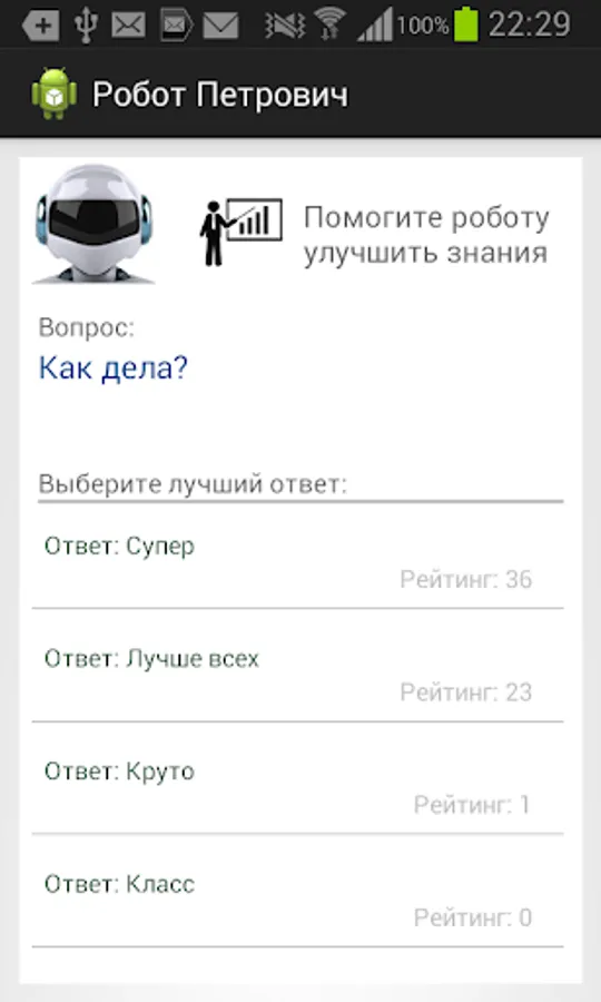 Ask questions about the robot. If he does not know the answers, help him, answering his questions. Talking with a robot can improve its knowledge base, thus it will answer the questions of other people.