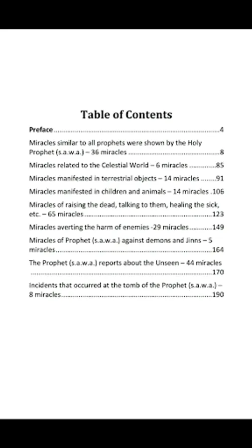 The app (originally published as book) is an extract of nine chapters from one of our great books Hayaat Al Qolub of Allamah Mohammed Baqir al-Malisi (ra) written in 1087 A.H. We have extracted these chapters, deleted similar traditions, re-arranged the traditions from the english translation of the book published by Ja’fari Propagation Centre, Mumbai. We have selected around 220 miracles indicating the divine power and divine knowledge of Holy Prophet (s.a.w.a.)