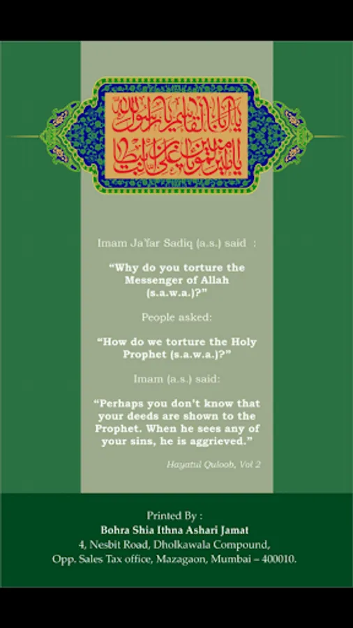 We present this book with intention to seek blessings of Holy Prophet (s.a.w.a.) and his progeny (a.s.). We dedicate it to our Holy Imams buried without a shadow in Jannatul Baqi viz Imam Hasan (a.s.), Imam Sajjad (a.s.), Imam Mohammed Baquir (a.s.) and Imam Sadiq (a.s.) and the mother of Hazrat Abbas (a.s.) Janabe Ummul Baneen. And, of course we dedicate it to the mother of our eleven Imams and the daughter of Holy Prophet (s.a.w.a.), Janabe Zehra (s.a.) whose grave will remain hidden in Medina till her last son, Imam Mahdi (atfs) remains in ghaibat!