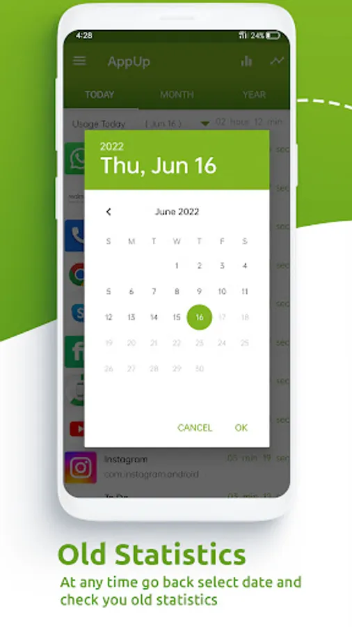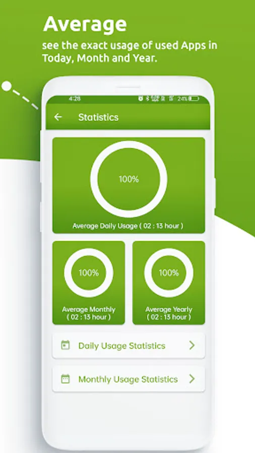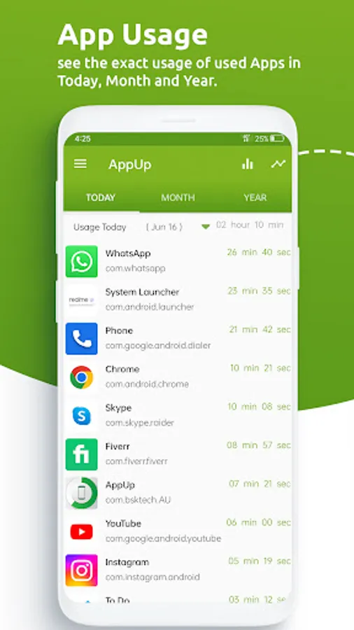✔ Self Control App Usage Main Features at a Glance: - Clean and neat design with fresh and intuitive design - Accurate app usage tracker - Track your phone usage and app usage Hourly, Daily, Monthly, and Yearly - See usage reports and graphical statistics of the usage of your apps - Battery usage optimized - Easy access to historical data Download App Usage Tracker to start tracking of your apps usages, and reducing mobile apps usage to save the time for expensive job or study, let us know about any bugs, questions, feature requests or any other suggestions.