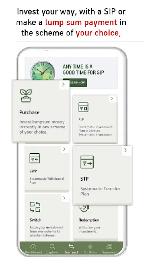 • Initiate all types of transactions like Lumpsum, SIP, STP, SWP, Redeem and Switch in any of ABSL mutual scheme of your choice
