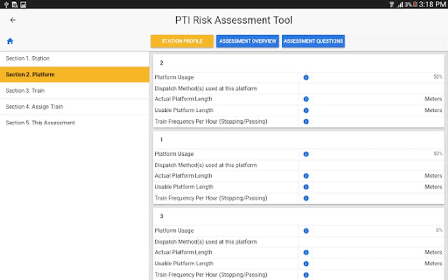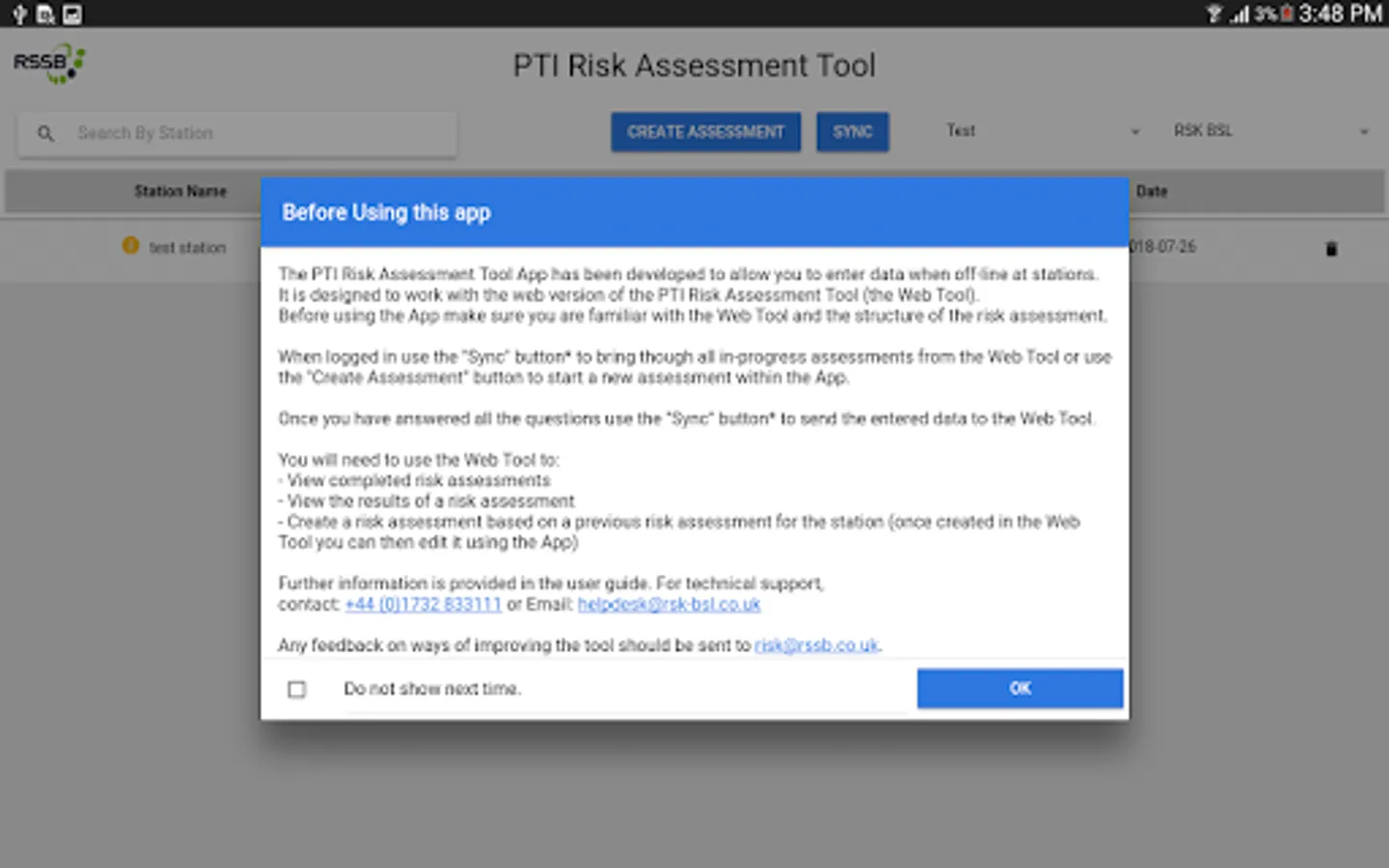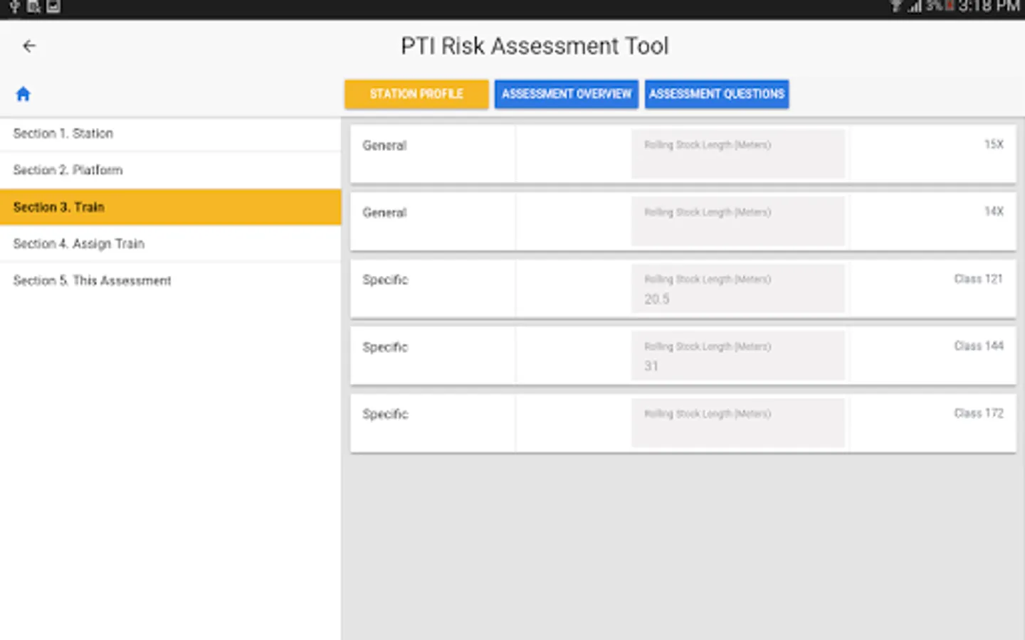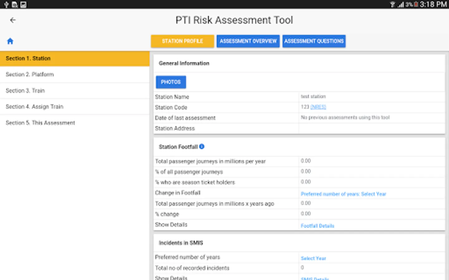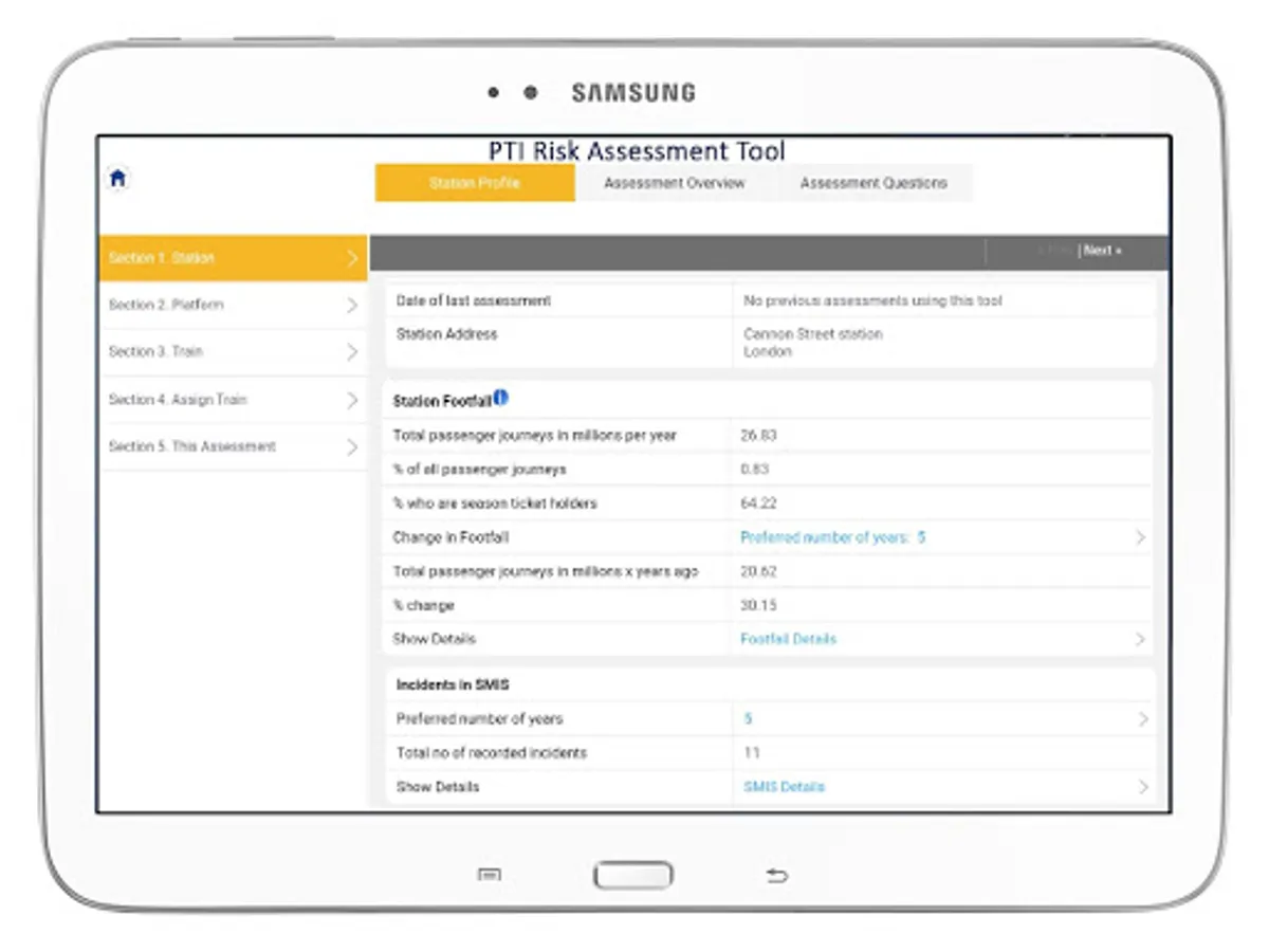 This application provides railway companies with a means to complete PTI risk assessments at stations without being connected to wi-fi. The tool provides a common, transparent approach to PTI Risk Assessment which will lead to better sharing of information and prioritising of stations requiring attention.