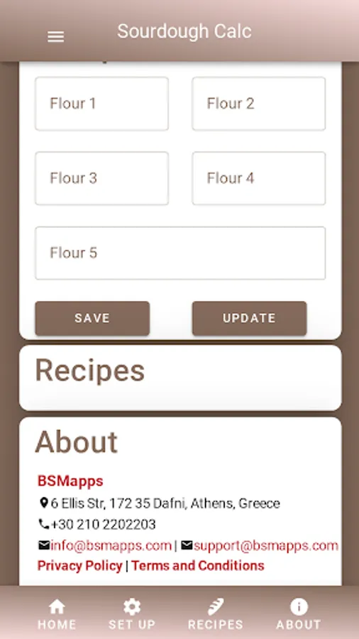 You can view a recipe by pressing on its title, or, by using the relevant icons, to delete it or edit it. If you edit a recipe, you can change the texts and when you Save it, a new one will be created with a new date.You can use the settings screen to define five flours you use mostly, for example All Purpose, Semola Remachinata as well as your typical procedure of making of your bread. You can save these and recall and edit when you require. These will be used as names for the calculator and recipe generated, as well as the notes template you have created.