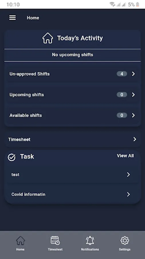 Home page: You will be able to monitor all your upcoming shifts, View shift details and important shift notes, accept new available shifts and view and complete tasks given to you all from your home page.
