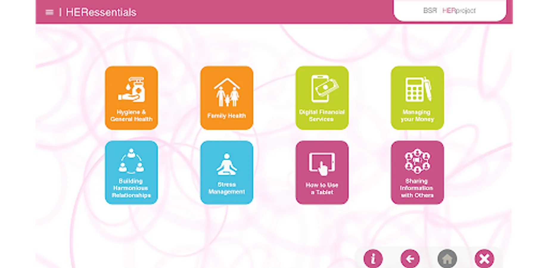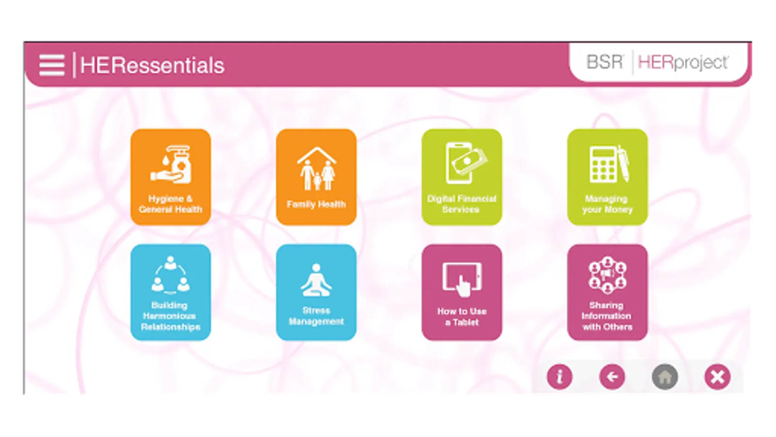 The HERessentials app was developed with workers in mind—ensuring usability for those with low tech literacy and low literacy levels. Once downloaded on tablets, the app is available offline, thereby catering to workplaces where connectivity is low and providing accessibility even in times of social distancing. The application includes animations teaching core concepts, games to solidify understanding, and pre- and post- quizzes to gauge learnings.