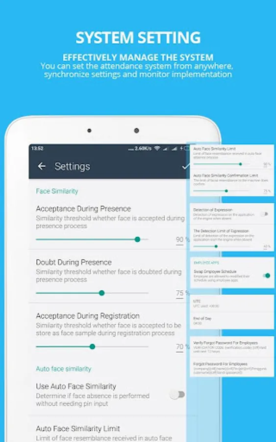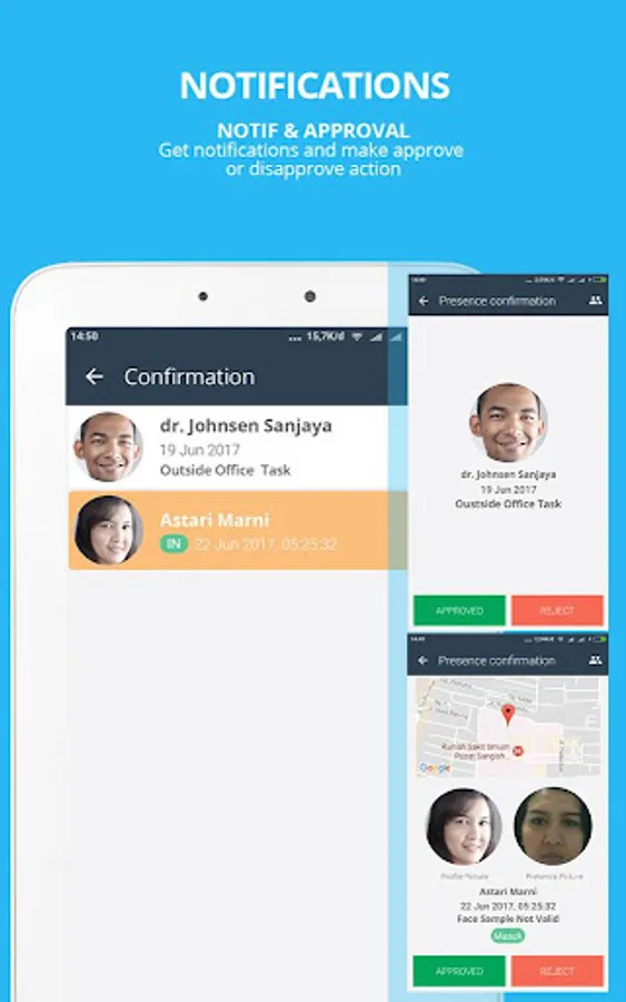 SmartPresence provides a complete solution for attendance management, from recording, managing, processing schedules and attendance reporting. In recording the presence of smartpresence, it is equipped with a face recognition feature. Face recognition feature functions for validation when making absences. In addition to validation using face recognition, smartpresence also has GPS restriction that can determine where the employee can attend.