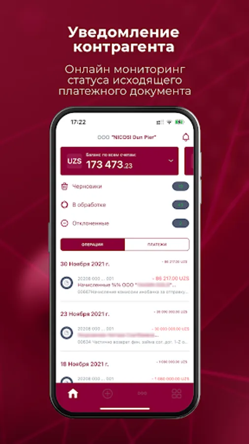 - Notification of the counterparty (sms, email) about the status of the outgoing payment document;