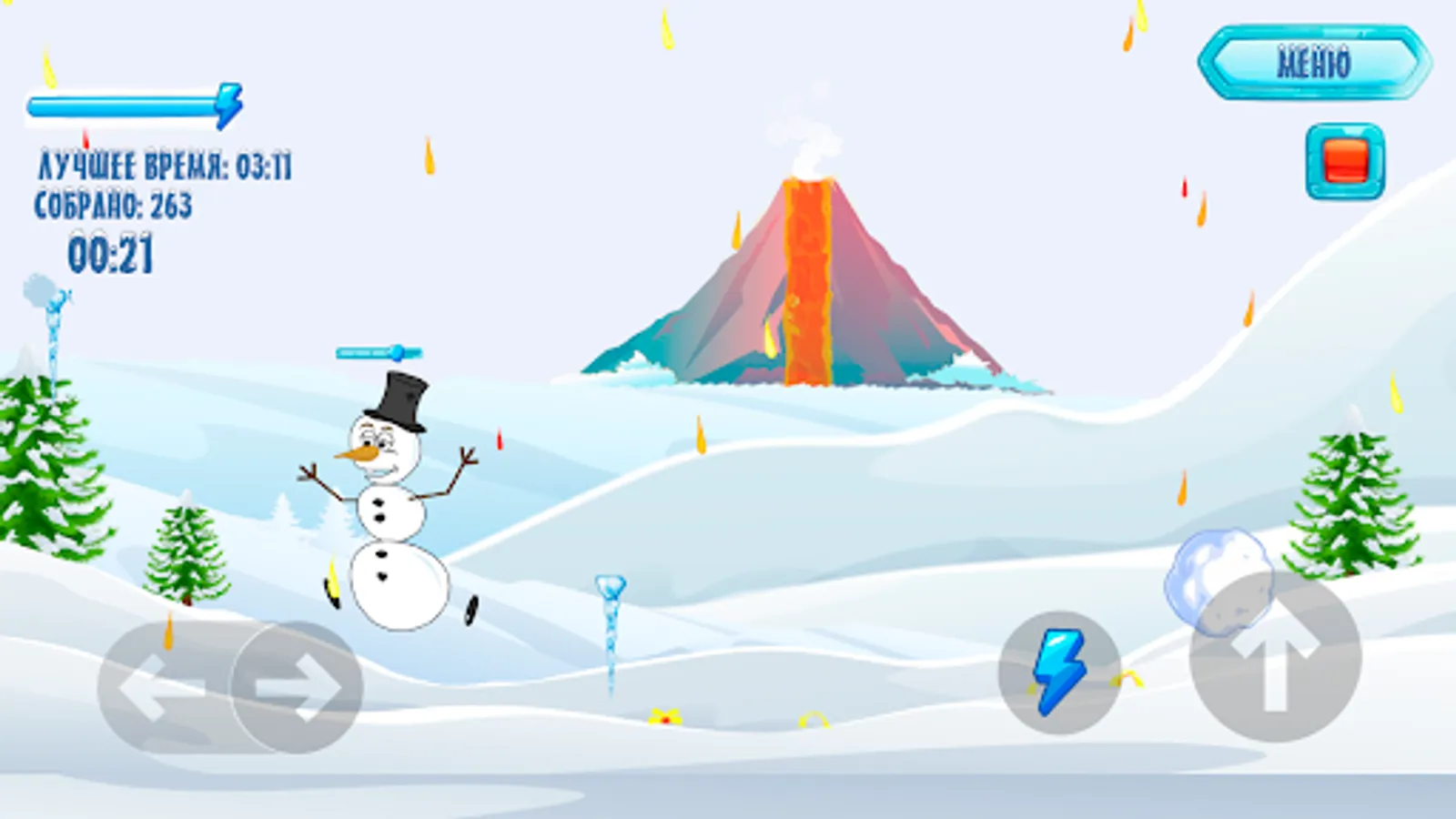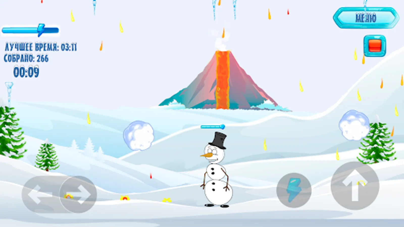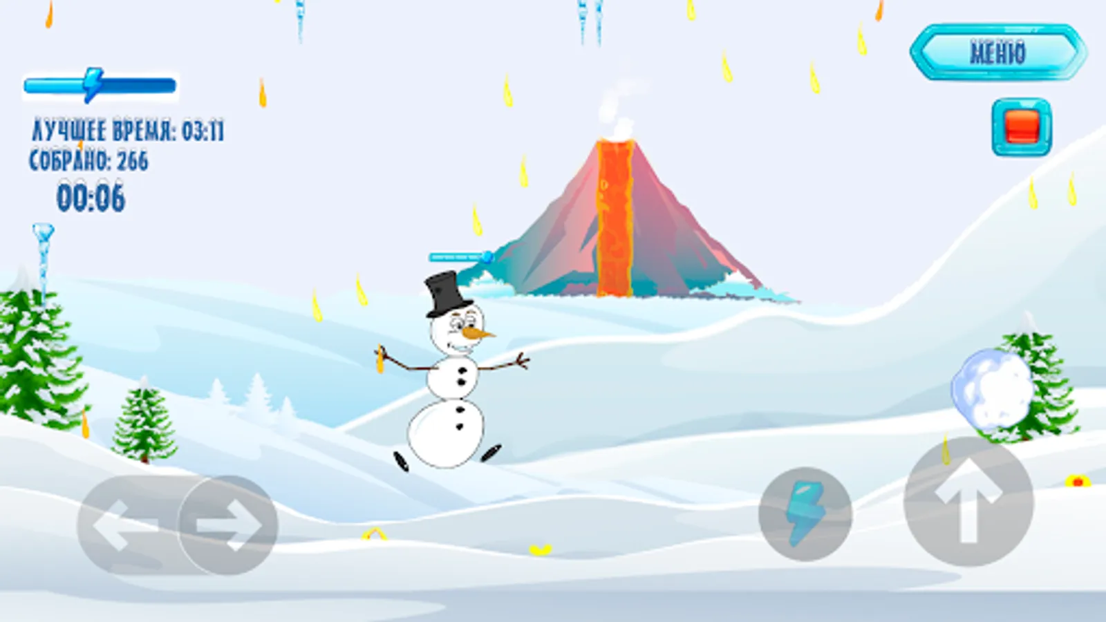 Snowman Run is an addictive arcade game where your task is to help the snowman save his life by escaping from lava drops and collect ice cubes to get bonus points.
