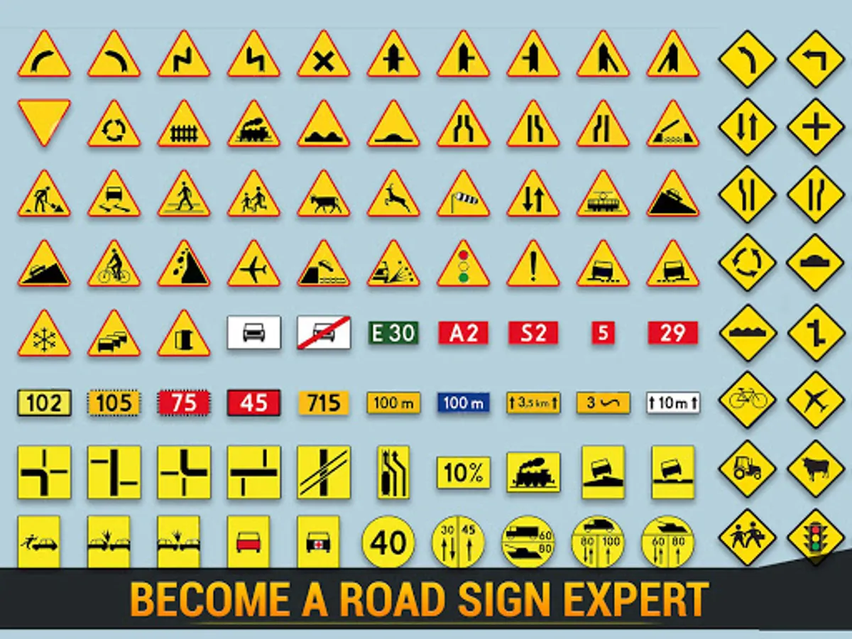 Here multiple road signs for learning how to handle on busy roads. A white background indicates a regulatory sign, use of red on signs is limited to stop, yellow conveys a general warning message, green shows permitted traffic movements or directional guidance, green indicates pedestrian crossings and school zones, orange is used for warning and guidance in roadway work zones and brown is for guidance to sites of public recreation or cultural interest. Also learn warning signs, railroad and light rail transit grade crossing signs, limited vehicle storage space between intersection and tracks, temporary traffic control signs, Mandatory movements in lanes, pedestrian and bicycle signs, pedestrian detour signs, bicycle guide signs, pedestrian signal education now learn these all driving rules & prove yourself a real champion driving master of this driving school games 2020. Must Share your experience about learning driving. Rate us! For best driving learning & drifting. Your feedback important for creating more learning & interesting games.