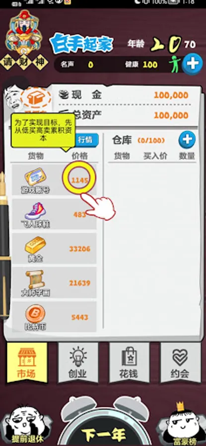Market: Click on items to buy/sell, buy low and sell high, expand warehouses, and complete capital accumulation