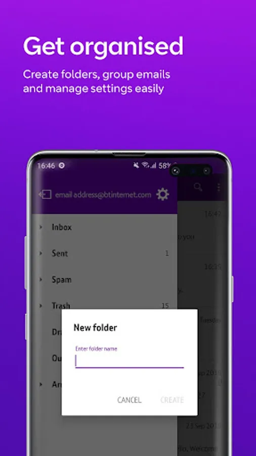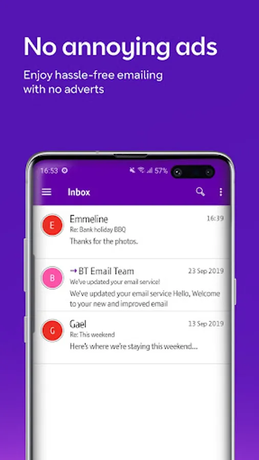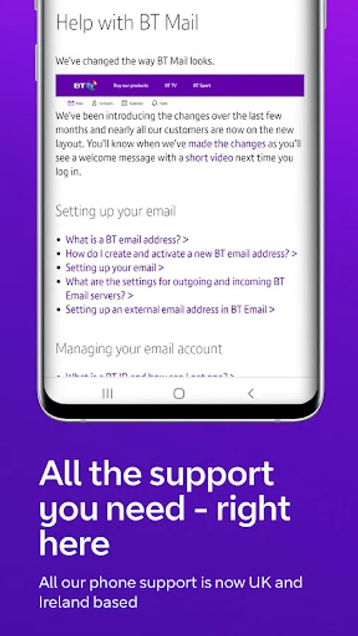 his is what you will get: - A brand new app – Designed specifically for our email service, completely BT-run and UK supported. - No need to worry – our world-class cyber security protects your email to give you complete peace of mind. - Hassle-free emailing - the app has a clear, user-friendly interface that makes it easy to send, read and organise your email. You can group emails by date received, contact or classification and add folders at the touch of a button; then manage your signatures, autoreplies and more via the settings menu. - Help is close at hand – Our free support comes from advisors based in the UK and Ireland, so asking for help and advice couldn’t be easier. - We’ve got rid of the ads - even better, there’s no annoying advertising.