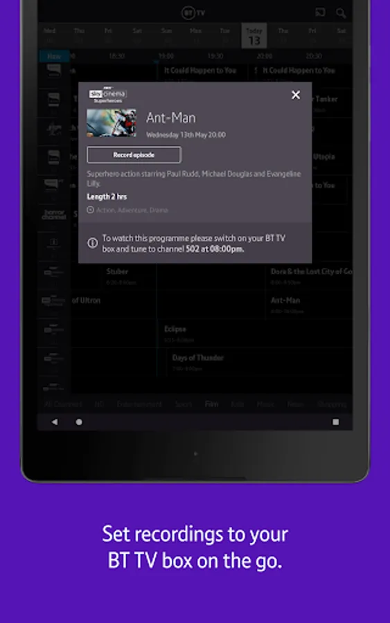 Not a BT customer, but have a YouView box*? No problem - you can also use the app for all your remote recording needs. Simply go to the Live menu, and then the Schedule tab. From here you can tap any programme to set recordings. You can also select My TV from the main menu to then view your list of recorded and scheduled programmes.