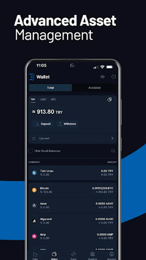 You can place buy and sell orders by using Market, Limit or Stop orders with advanced trading tools. You can use TRY and USDT parities. You can convert your crypto assets whose total value is below the minimum order amount to Turkish lira by using the "Convert" feature.