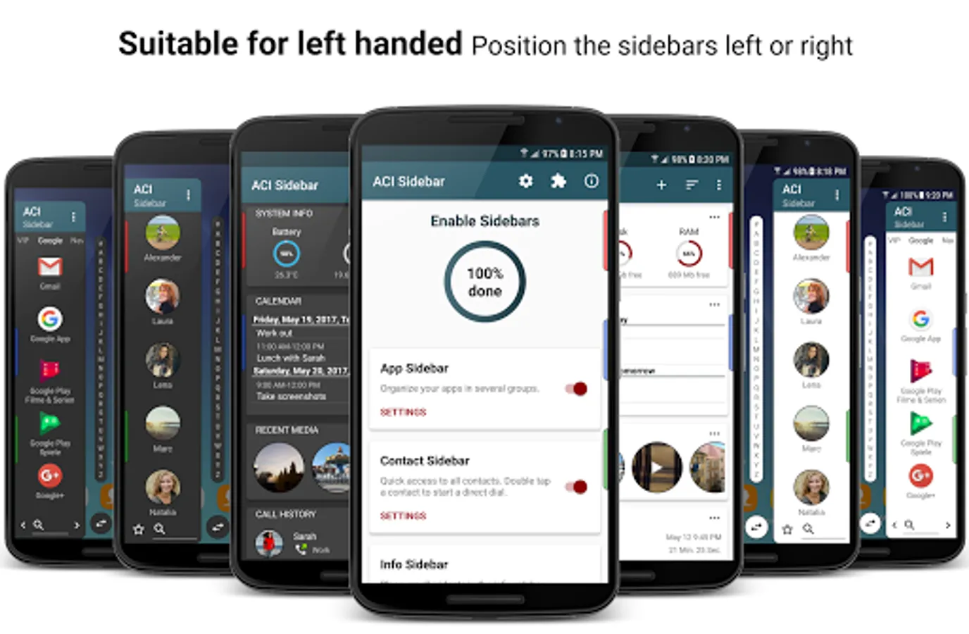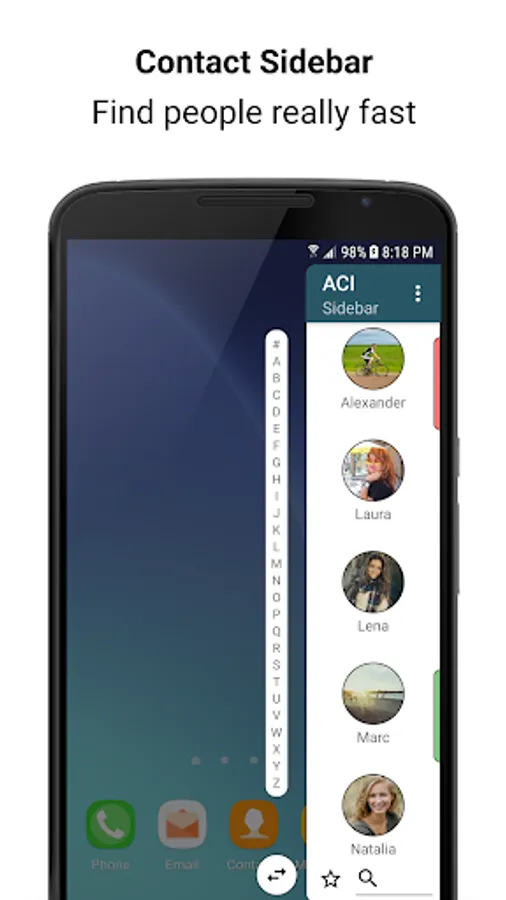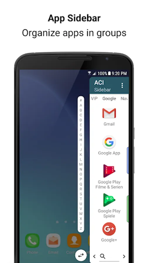 Provides instant access to all your apps. To find apps faster, the apps can be organized in groups, on which can be navigated in the sidebar. Single tap an app to start it, double tap to open detailed app informations.