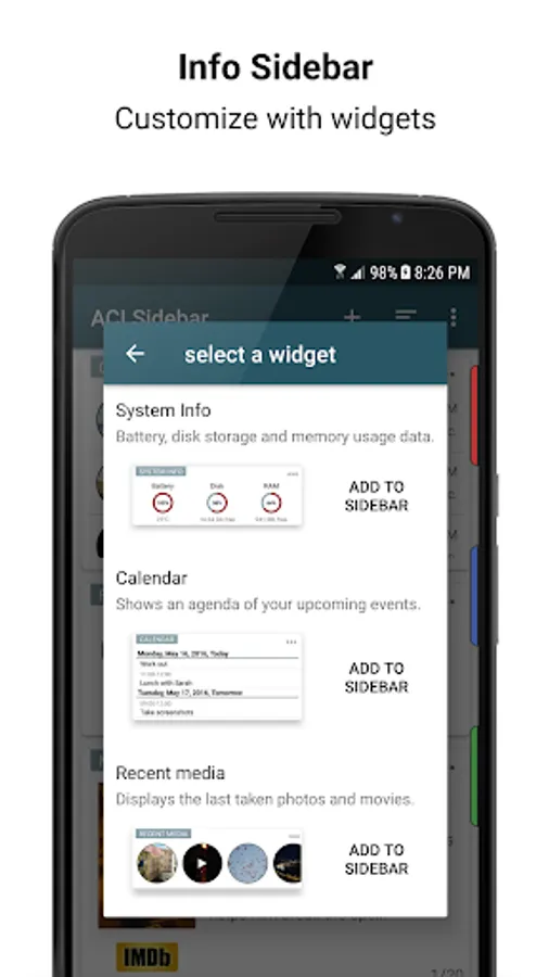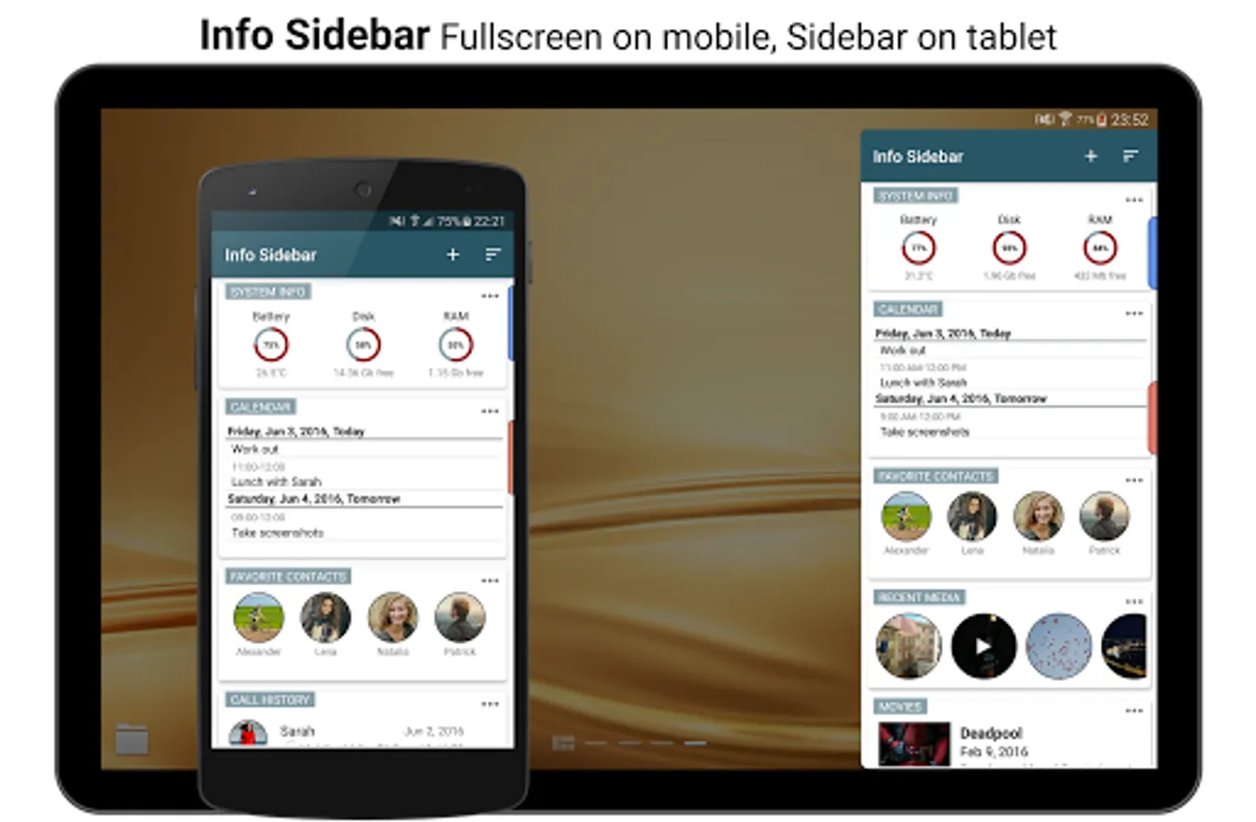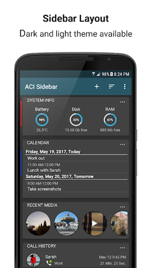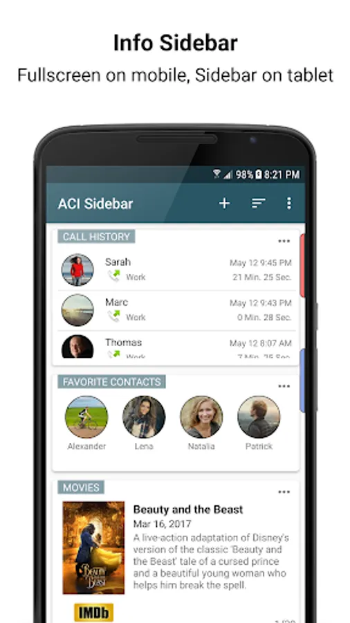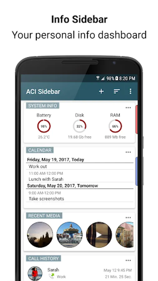 Add small widgets to the sidebar and have them always available. There are different widgets displaying different information, e.g. a calender agenda, a call log, photos & images and more. Customize the info sidebar according to your needs.