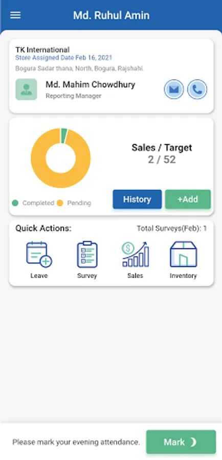 This app is designed and developed for managing field sales teams to manage their attendance and sales reporting. People who are authorized to use the app are given the login details by company and they can access the app. Field teams use this app to report their morning and evening attendance along with their selfies and customer surveys that they collect while they are at work. They also have feature to report competition survey reports and can work based on PJP.