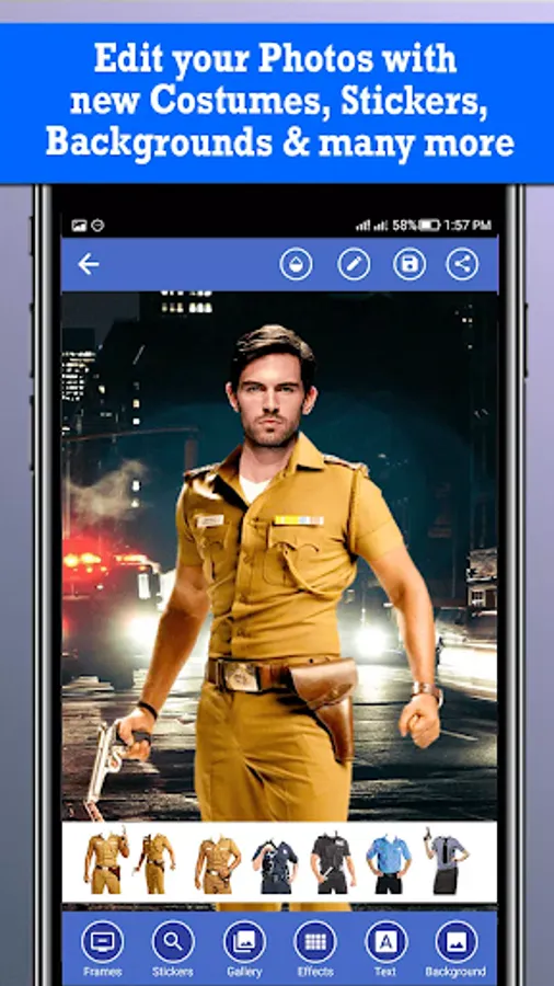 Set any attractive background to your photo from the collections in this men police dress app or select any picture from your gallery.