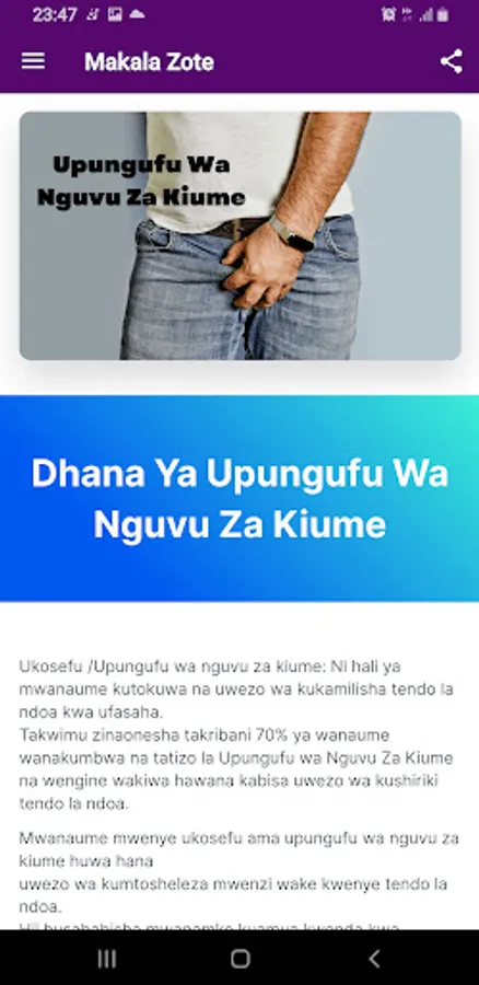 This app is responsible for publishing articles on reproductive problems for men, especially those related to Impotence, Prostate and its causes. but it also gives a chance to find ways to treat the problem, how to get medicine as well as knowledge about reproductive issues for men.
