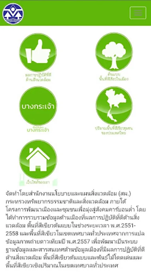 Prepared by the Office of Environmental Policy and Planning (OEP), Ministry of Natural Resources and Environment Under the city and community development program to aim for a low carbon society By collecting information on the city that results in good environmental practices Prototype green area during the period 2008-2015 And green areas in municipal areas throughout the country from the satellite image data translation year 2014 to develop into a database and city information system that has good environmental performance Prototype green areas and outstanding plant species and quantitative green areas in municipal areas throughout the country