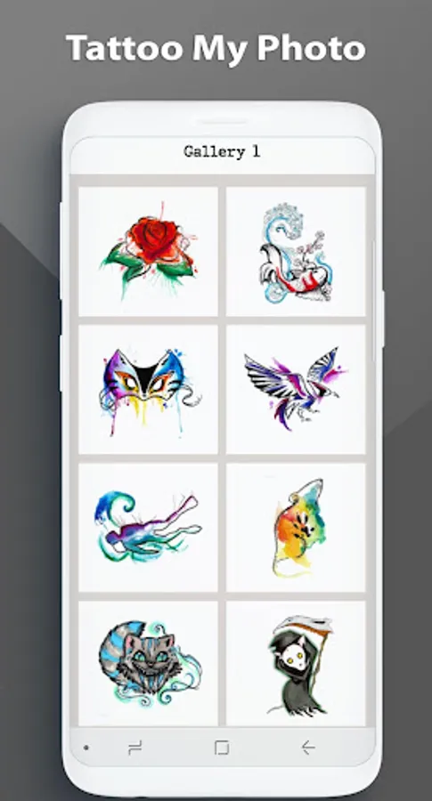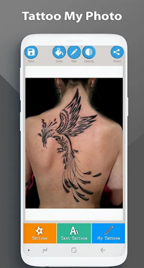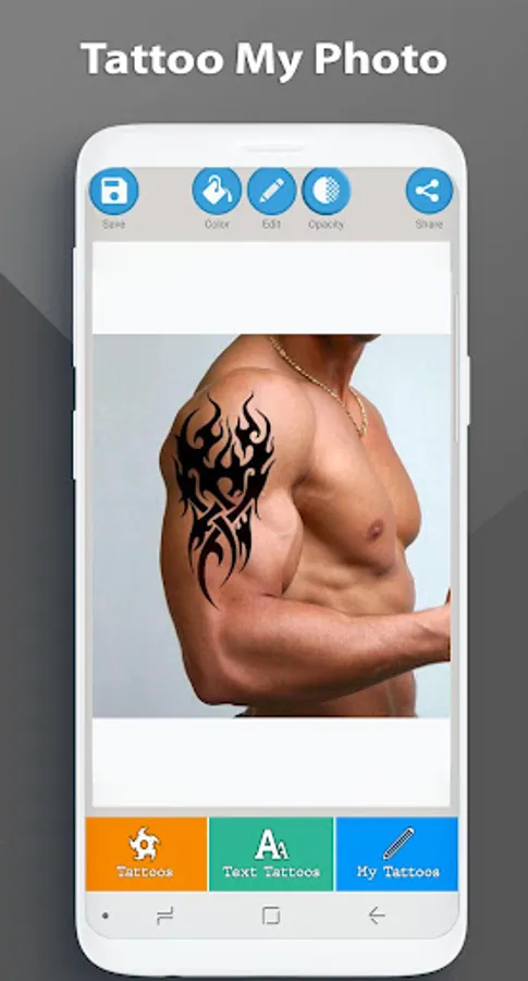 Tattoo my Photo app lets you put new tattoo designs on what ever you want, Tattoo yourself on your own photos. Just choose a pic from gallery or take one using camera, choose the inked tattoo design that fits your style, rotate, resize, save and share your effect! Let your friends think that you are really tattooed ;)