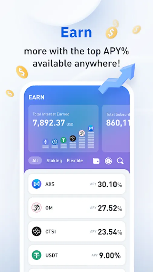 Put your idle crypto to work with our hand-picked staking products – earn up to 40% APY and 9% on USDT!