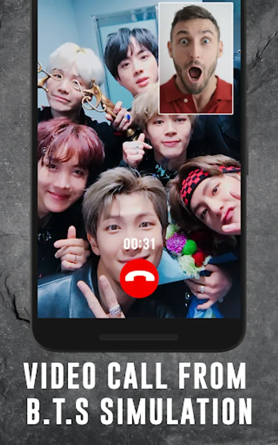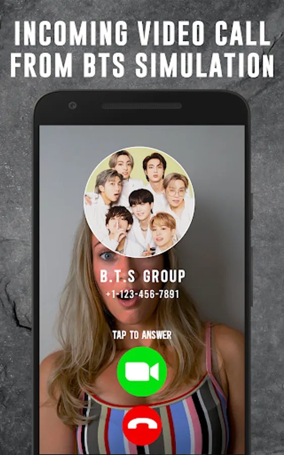 BTS fake video call prank-Call simulator allows you receive video call prank from BTS K-pop members and BTS Idols and prank your friends, family and kids that love BTS.