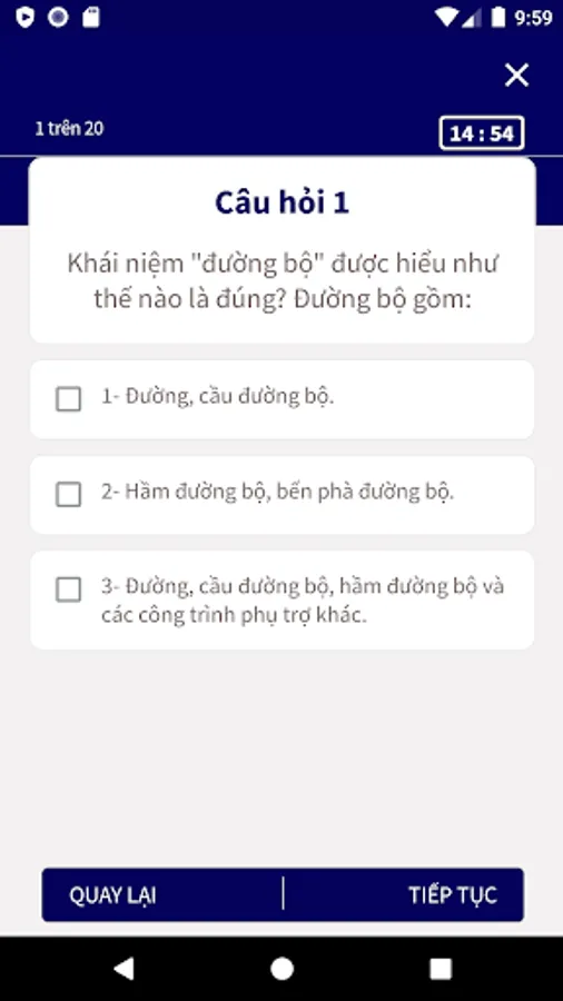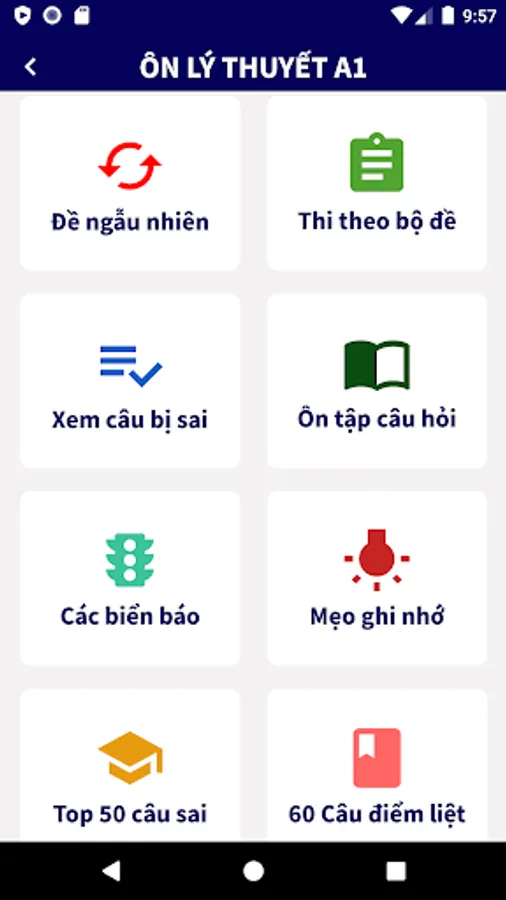 • Random exam with thousands of exam questions according to the structure of the test of the General Department of Roads of Vietnam Ministry of Transport.