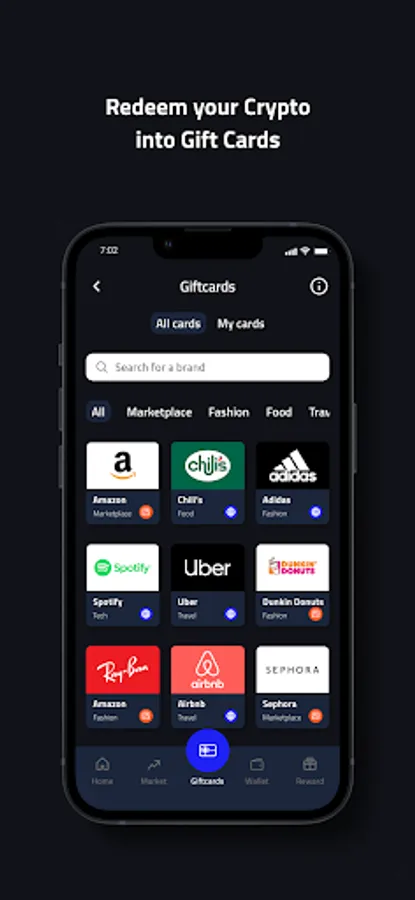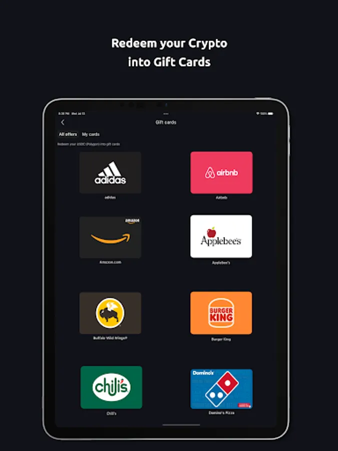 Convert your USDC token into 150+ giftcards, Amazon, Adidas, Asos, Google Play, Footlocker... You must have USDC on your wallet and you can spend your cryptocurrencies in your favorite stores.