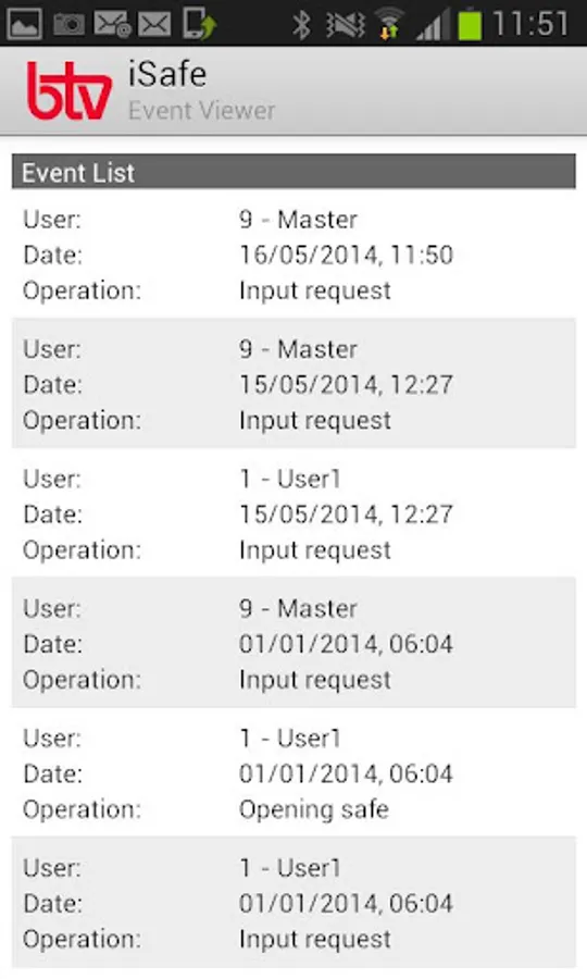 The app iSafe shows the record of the last 300 events with date and time.