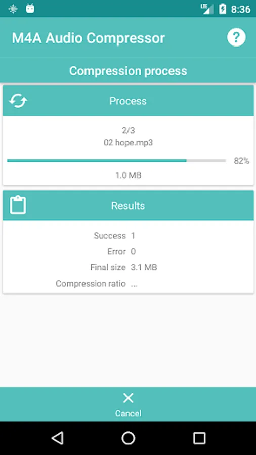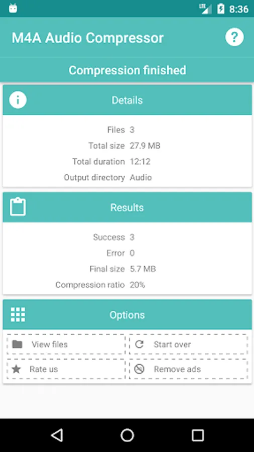 Very nice app for compressing music files after upgrading. Recomomd to install. Best among all audio compressor files apps Rely only this app.