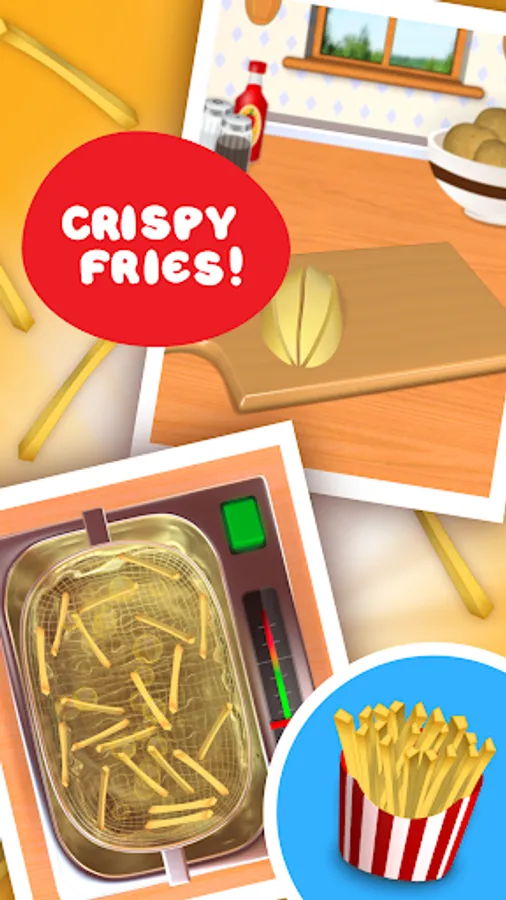 Make a tasty burger with crispy fries and refreshing drink. Eat it and then play with toys or take a challenge with a food delivery minigame.