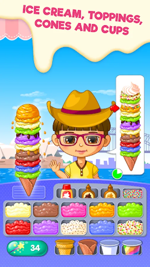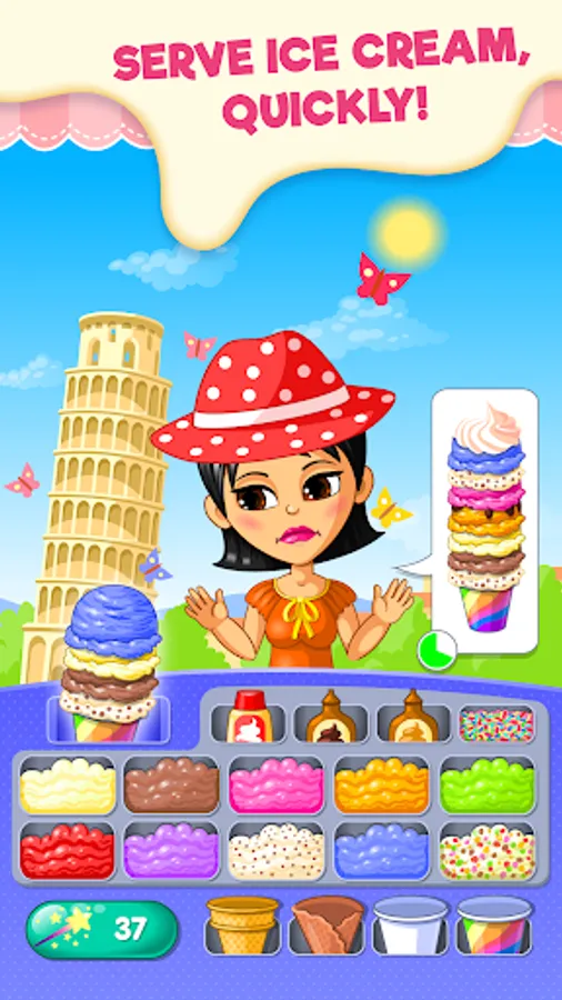 The whole world loves ice cream. Start this frozen and sweet adventure in Europe and continue travelling by truck to North America, South America, Africa, Asia, Australia and Antarctica. Prepare the most delicious ice cream towers as fast as possible within the time limit. Multi scoop ice cream can be composed of many different flavors, toppings, cones and cups. When you earn coins by serving your customers these refreshing treats, you will be able to expand your ice cream business.