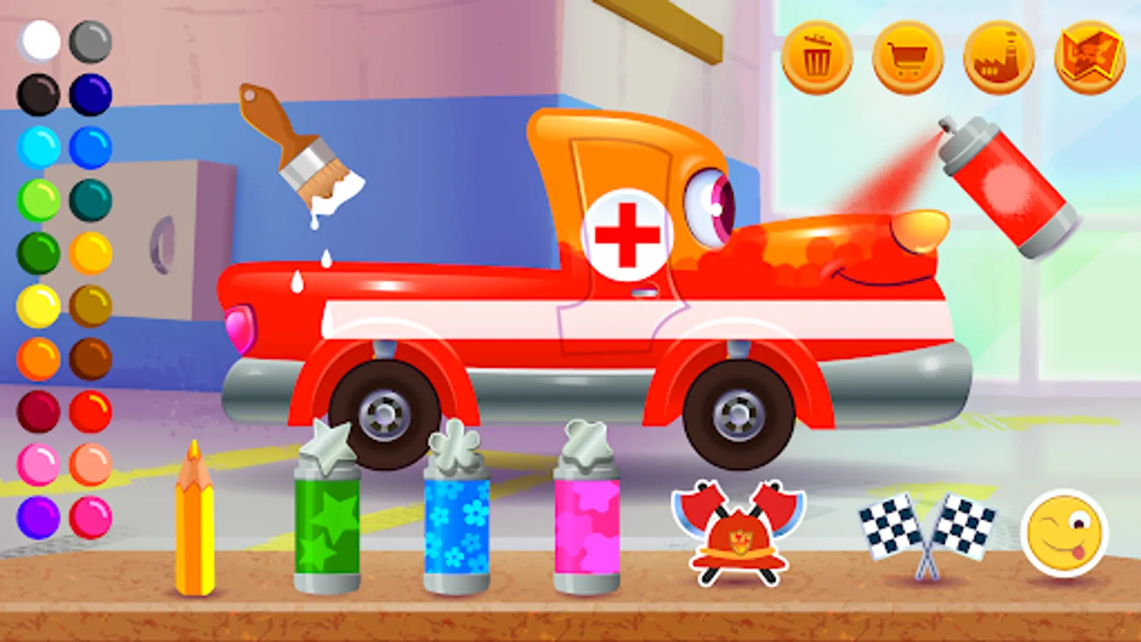 Pick out a car, pickup truck, tractor, or a monster truck and customize it in the factory. Unleash your creativity and paint, decorate, customize and tune up your vehicle. Add patterns, decorations, stickers, funky tires, a turbo engine and a tank to build a colorful street beast.