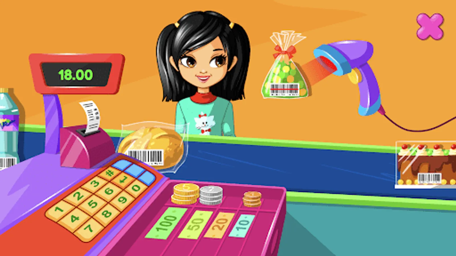 • Cash register: Have fun scanning items and issuing invoices. Learn about numbers and make sure to get the right amount of money, just like a real cashier.