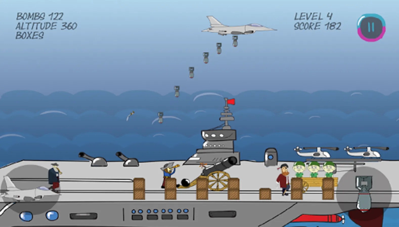 The aircraft must land on the deck of an aircraft carrier. But pirates seized the ship and hostages. Clear the deck from bandits and explosives to safely land the plane. Try not to hit the hostages.