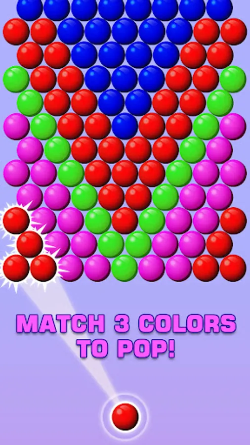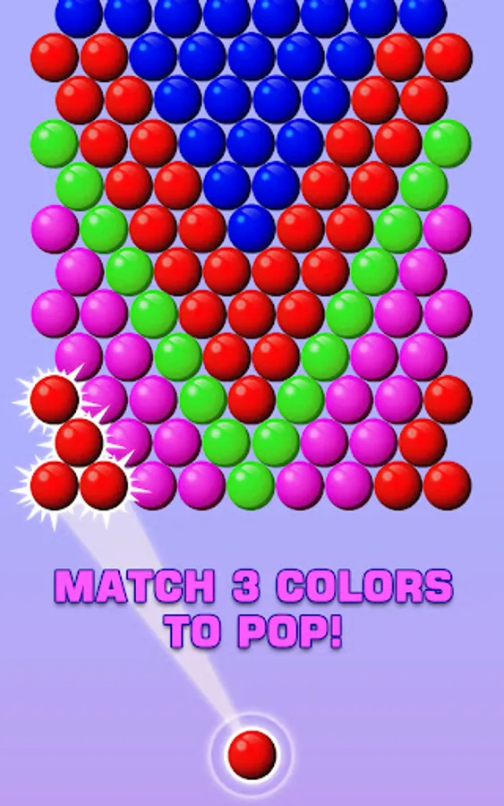 Shoot bubbles, Match 3 bubbles of the same color to pop! Clear the board and pass the level!