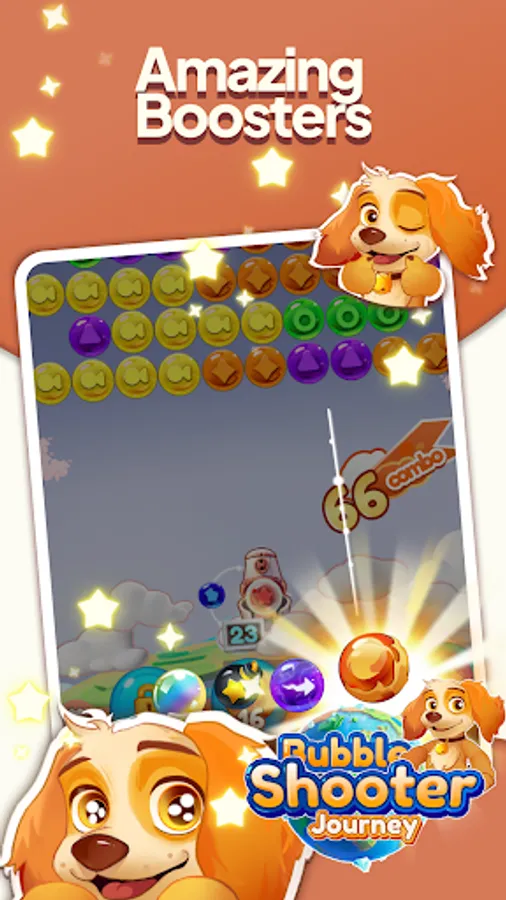 Are you ready to start an exciting journey and follow the map to explore the wonderful world? Let's go! Exercise your brain, ignite all the bubbles! Feel the joy in our game! Enjoy the healing sensation of continuously blasting bubbles! Come and play the exciting and joyful Bubble Shooter Journey with a cute puppy!