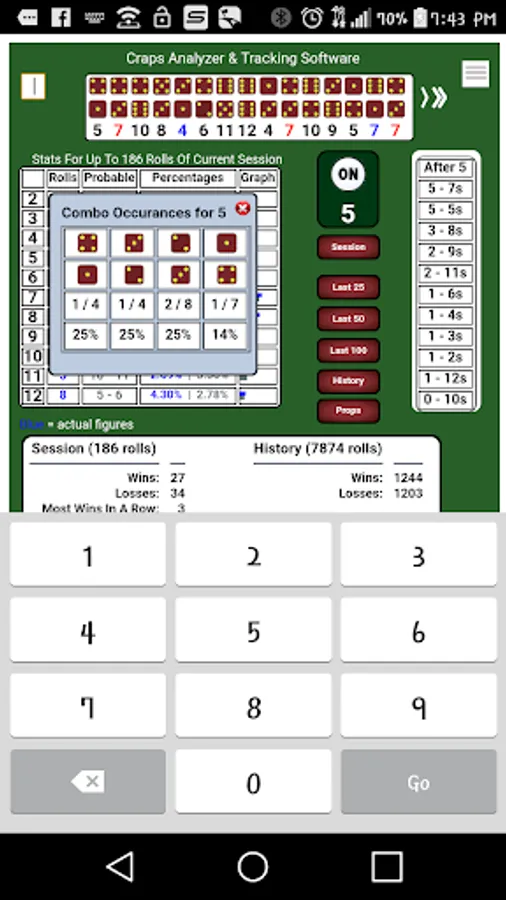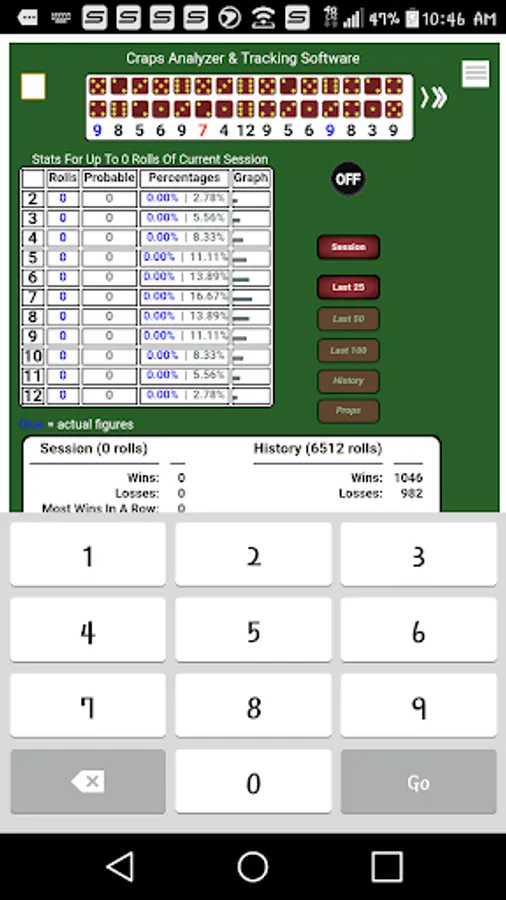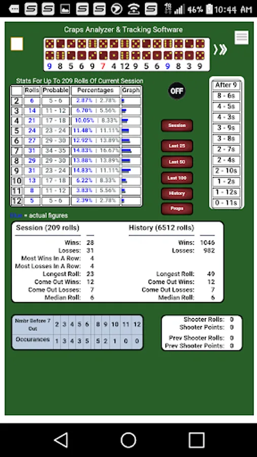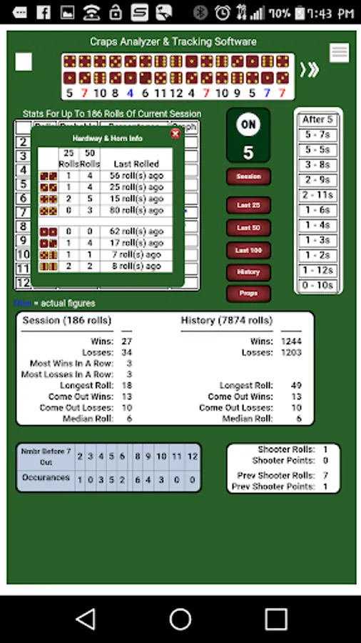 Keep a history of all rolls during a session or multiple sessions of this popular casino game. View the history of rolls for a complete session or full history along with a shortened 'prop bet' log. Reference statistical versus actual dice results.