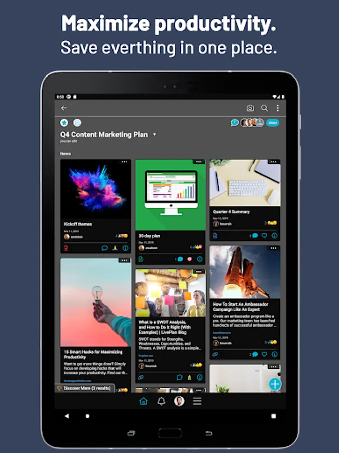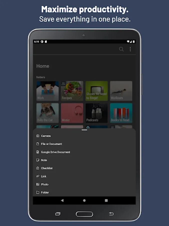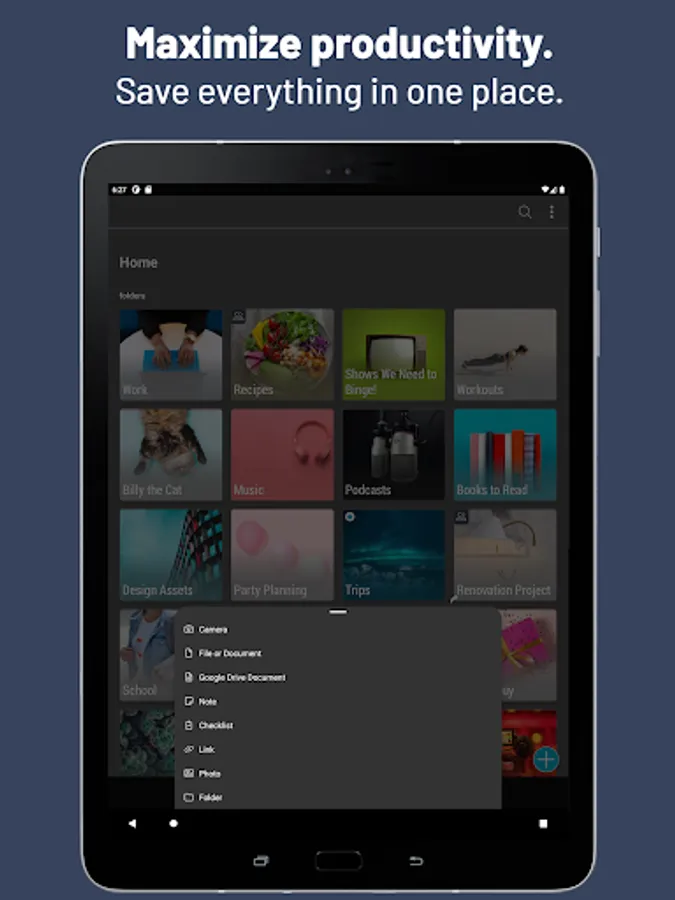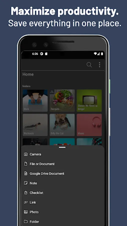 • Save any content side-by-side: links, notes, documents (PDFs, Word, Excel, Google Docs, etc.), photos, videos, emails, and more.