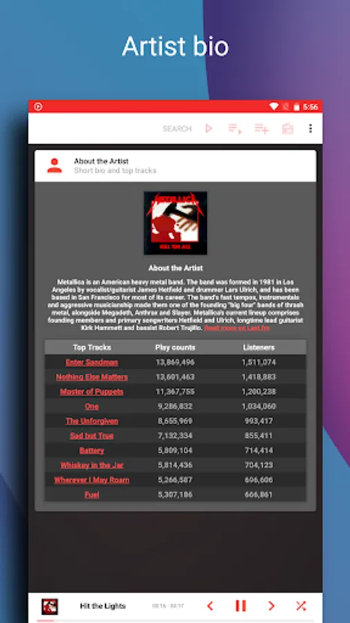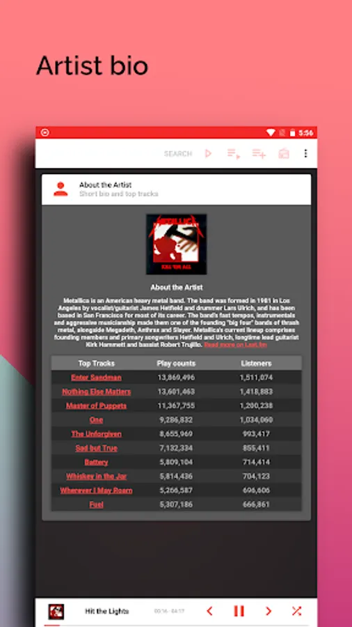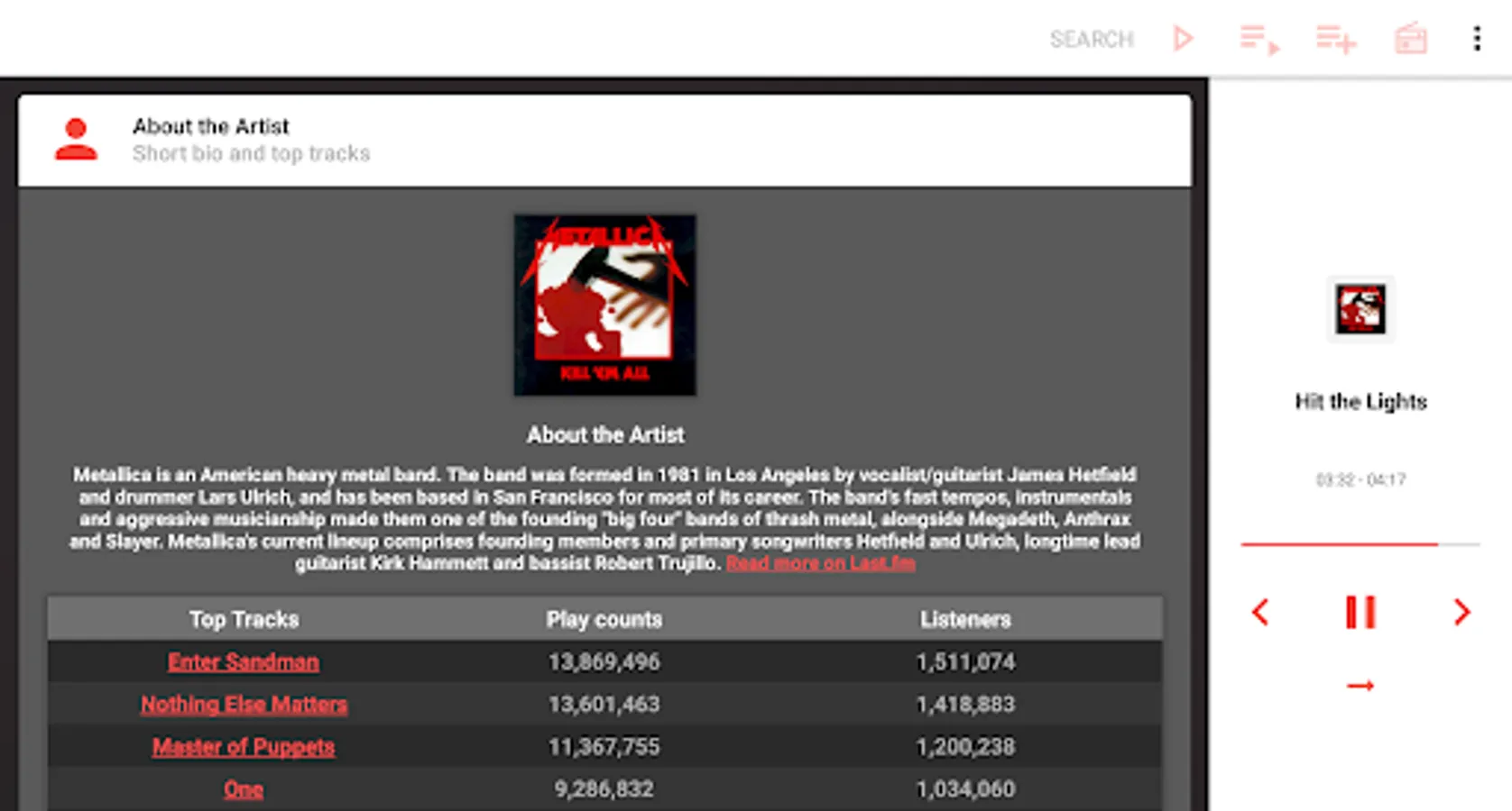 ➡ Artist details puller, which pulls artist bio information, artist artwork for the current track as well as top songs for that artist.