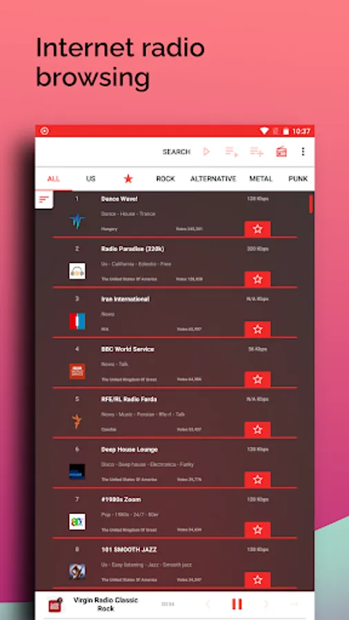 This music player (audio and radio player) is lightweight, simple, stable and unique while also providing many features and customizations to play around and have fun exploring them. This media player supports all major audio formats: mp3, mp4, ogg, wav, flac, m4a, acc, ac-3, webm and others!