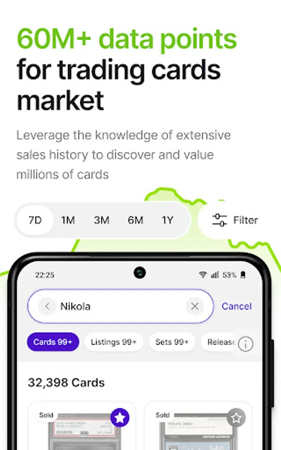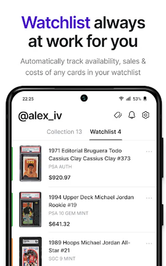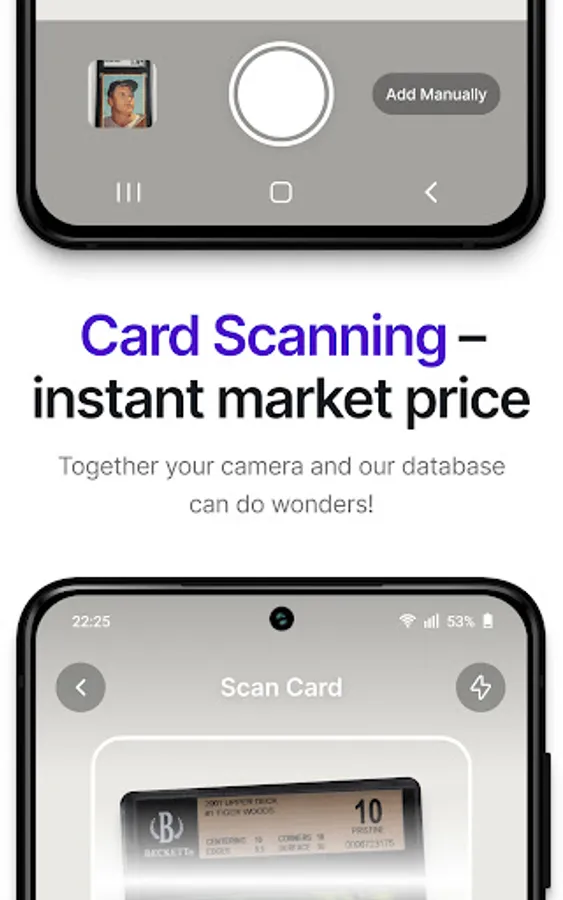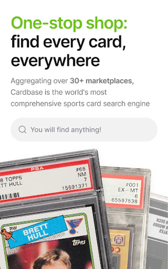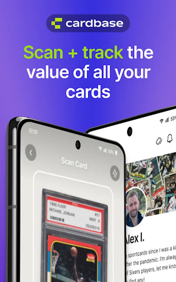 Scan & Value your Sport Cards with Cardbase and build your collection. Our card scanner app helps you to accurately scan, identify, and organize your card collection in seconds and provides you with its value. You can scan your cards using your smartphone camera and access pricing and detailed card data for over 13.5 million cards, leveraging the largest and most accurate database in the hobby. Easy to use with innovative new features, Cardbase will allow collectors of all levels to manage their portfolio simply and efficiently. Track the value of your collection with dynamic pricing and daily updates with the latest sold items across 30+ marketplaces and auction houses.