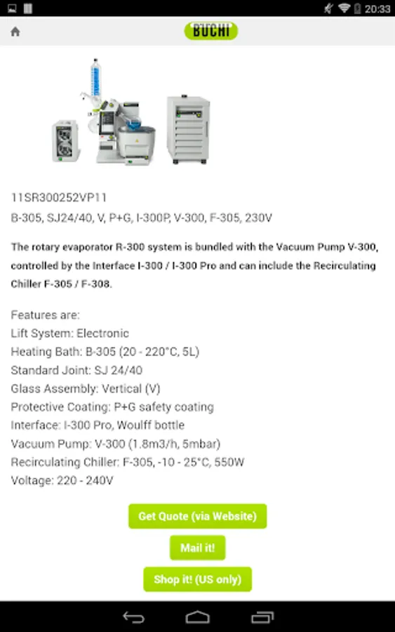 You want to buy a BUCHI lab equipment product such as a Rotavapor® and find the perfect fit for your need. This configurator guides you through various options of a typical BUCHI product. At the end of the configuration process you receive an order code with a picture of your tailor-made configuration. Share the results easily with others, request a quote or purchase directly online (US/Canada only).